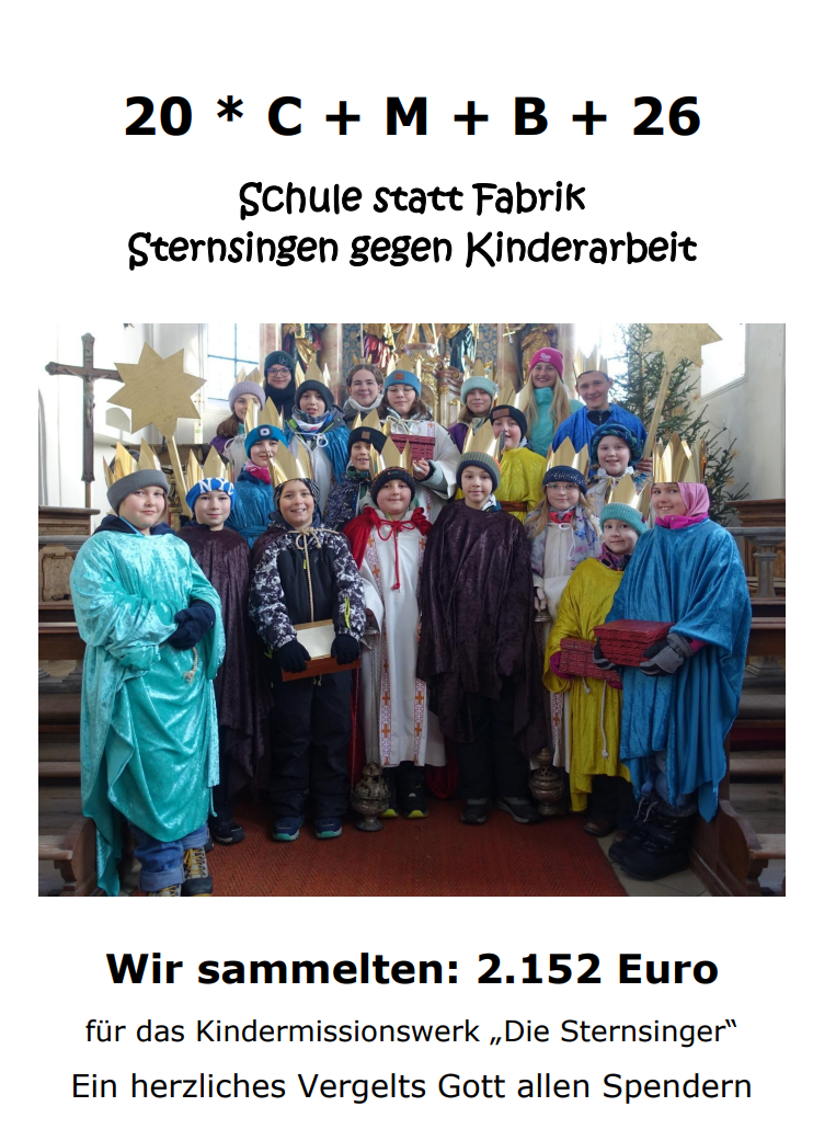 „Schule statt Fabrik“ – so lautete das Thema der diesjährigen Sternsingeraktion. Allein in Bangladesch arbeiten ca. 1,5 Millionen Kinder ab 6 Jahre in Fabriken unter schweren Bedingungen und für einen Hungerlohn. Mit der Sternsingeraktion können wir den Kindern helfen, wieder eine Schule zu besuchen, zu Bildung zu kommen, eine Ausbildung zu machen und so der Armut zu entkommen.